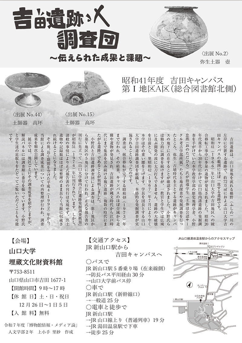 吉田遺跡は、山口盆地を流れる椹野(ふしの)川の左岸に位置する遺跡で、約72万uにおよぶ山口大学吉田キャンパスの範囲にほぼ一致する遺跡です。